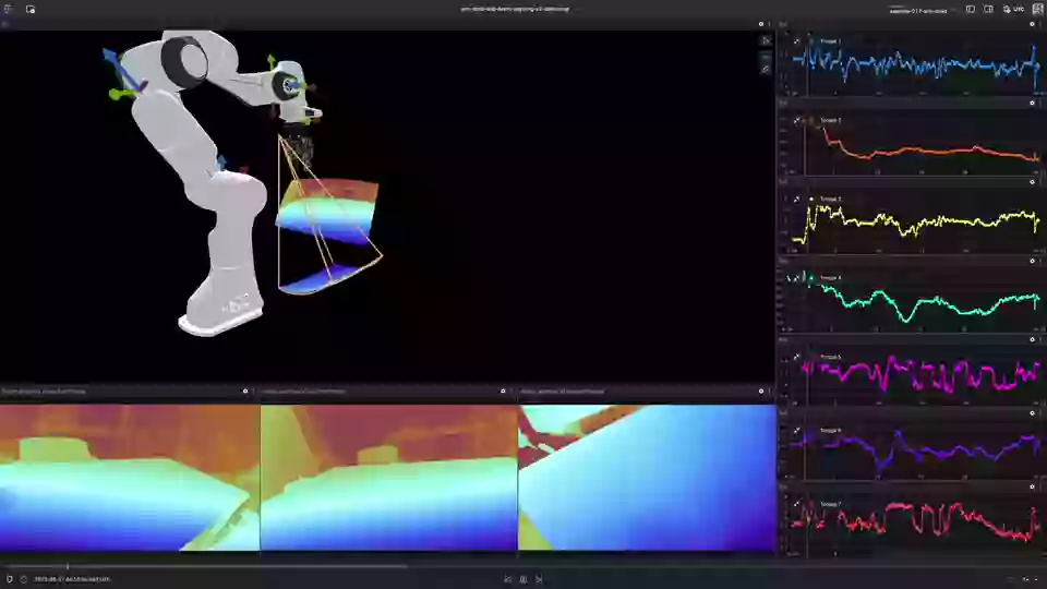 The DROID dataset trained using DepthAnythingV2 models plus the integration of time-series data from the Franka Robotics Panda Arm visualized using Foxglove. With parameter scales from 25M to 1.3B DepthAnythingV2 demonstrates strong generalization and broad applicability, achieving fine-grained details and enhanced depth accuracy.